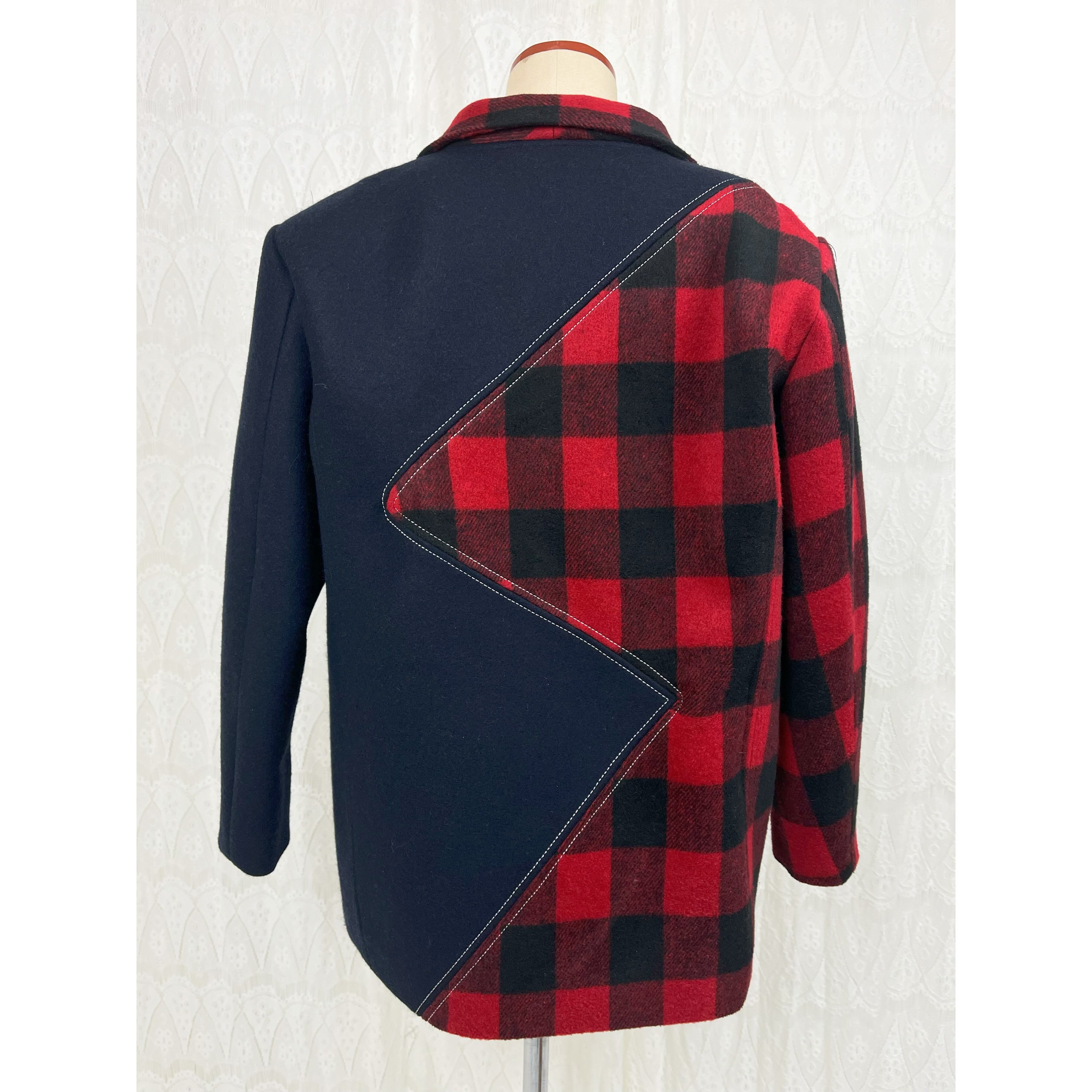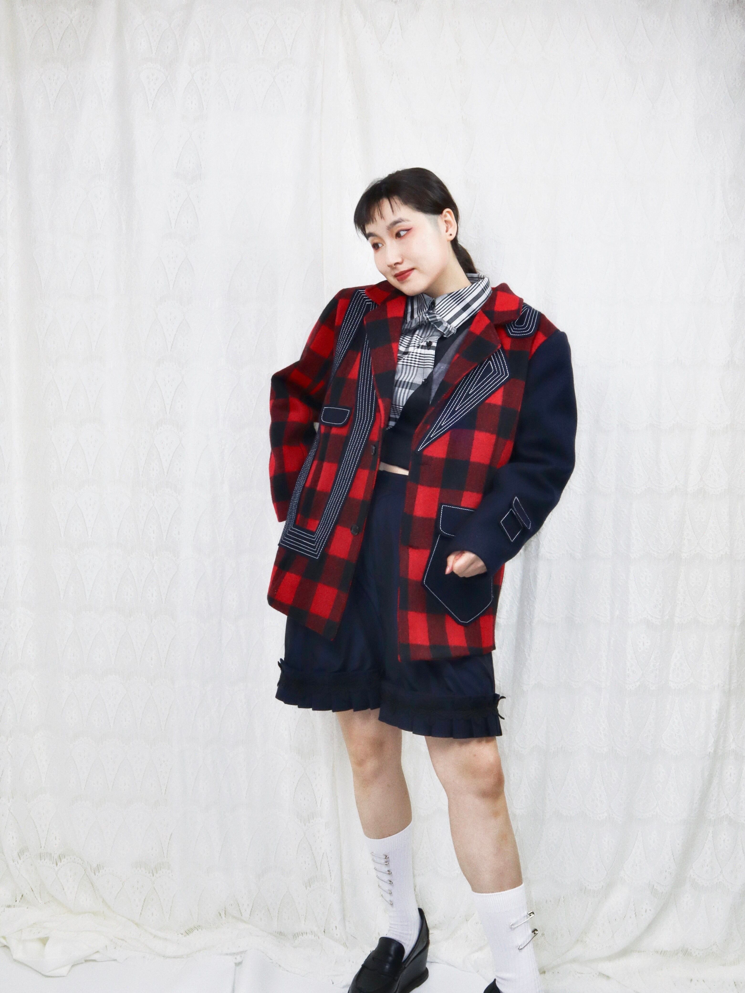 デザインポイントは正面のネイビー生地の部分ははジャケットの各パーツをバラバラにして、白糸でたたき、つけました。後ろは三角の切り替えで、面白さをアップして、左右袖生地違い、左見頃のポケットはもちろん、外袖にも飾りポケットをつけました。