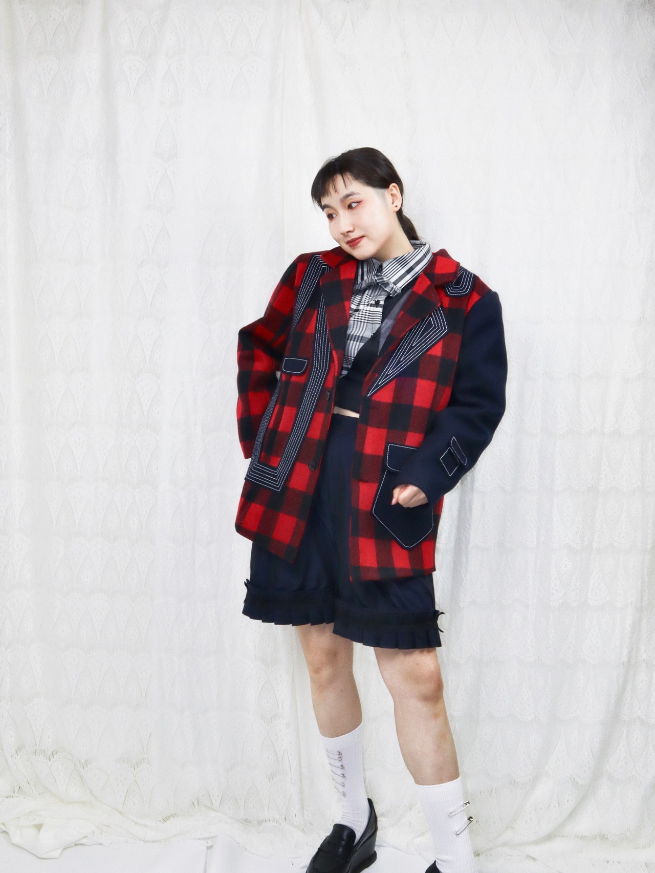 パッと目を引く赤チェック生地とネイビーを組み合わせてデザインをしました。