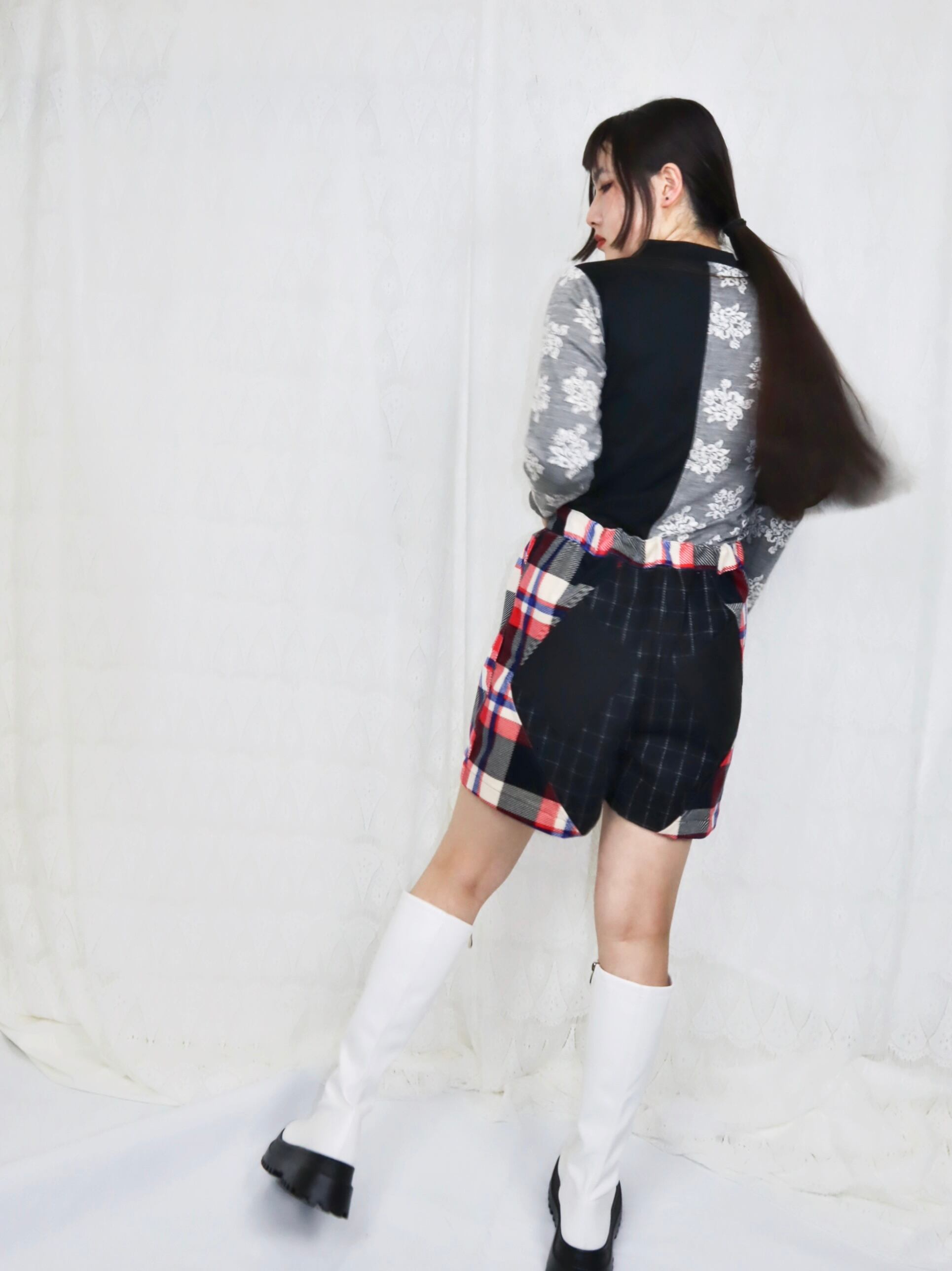 前見頃と後ろ見頃、ジャガードニットを使い、切り替え入れました。デザイン感アップのため、右袖は二重袖にしました。