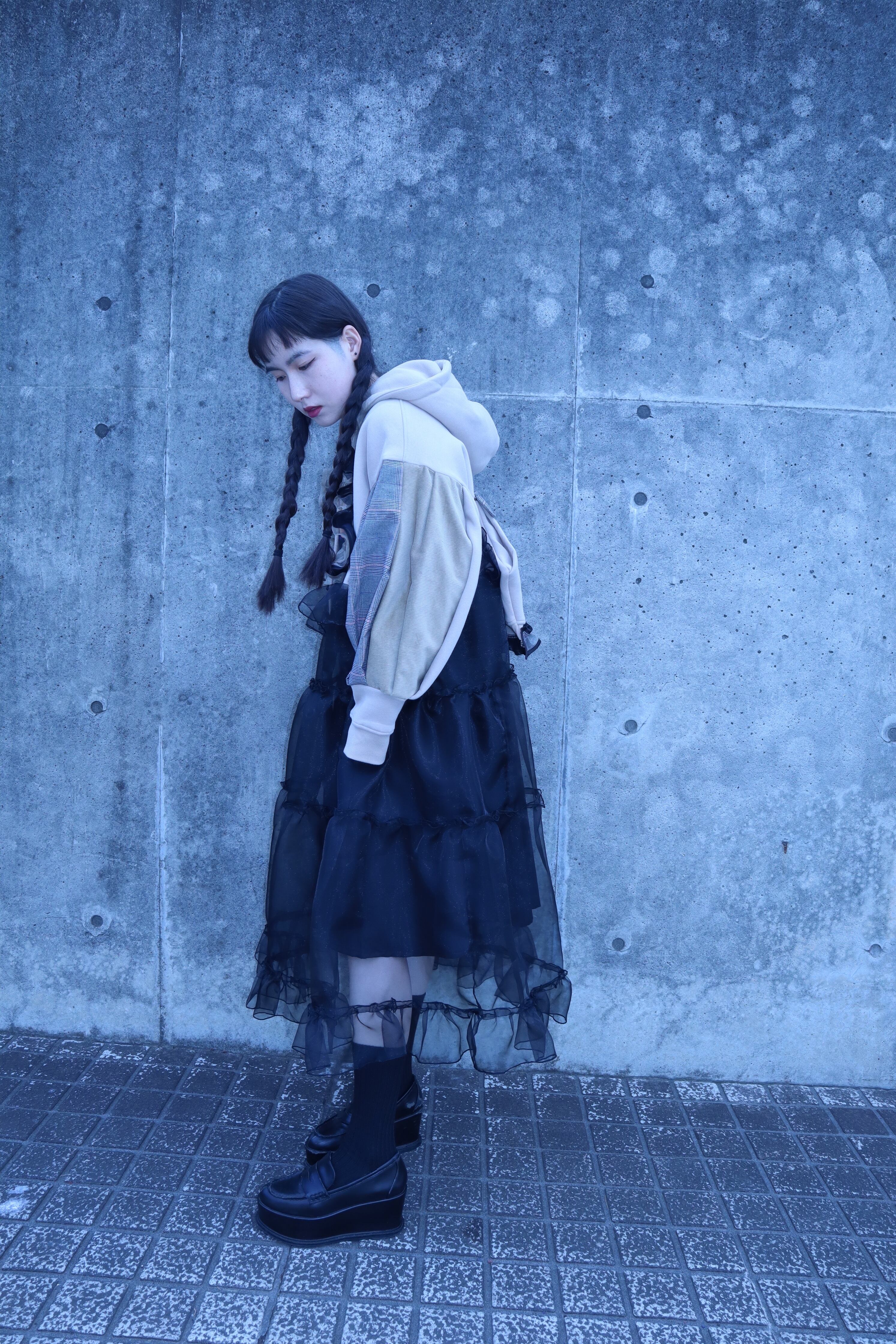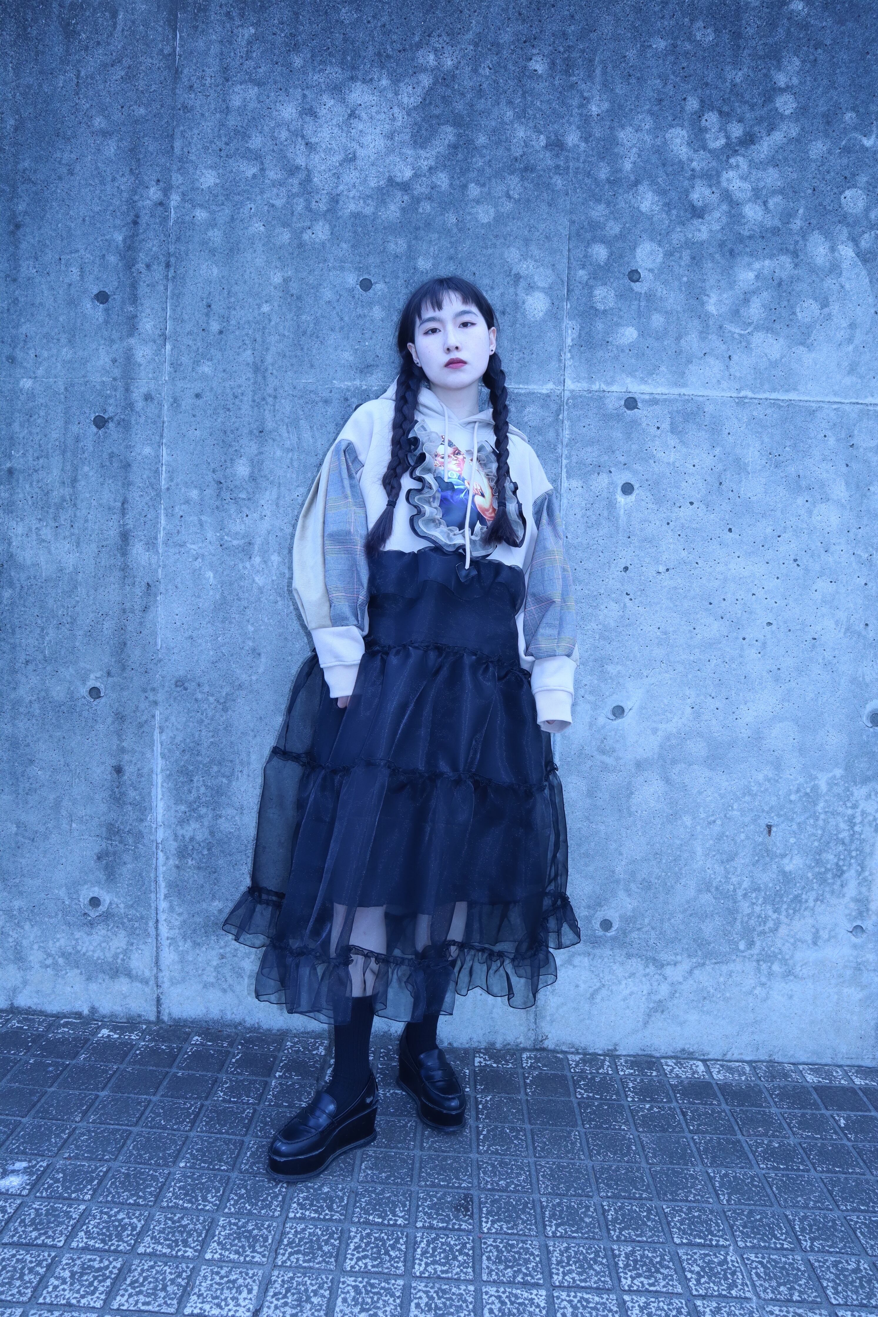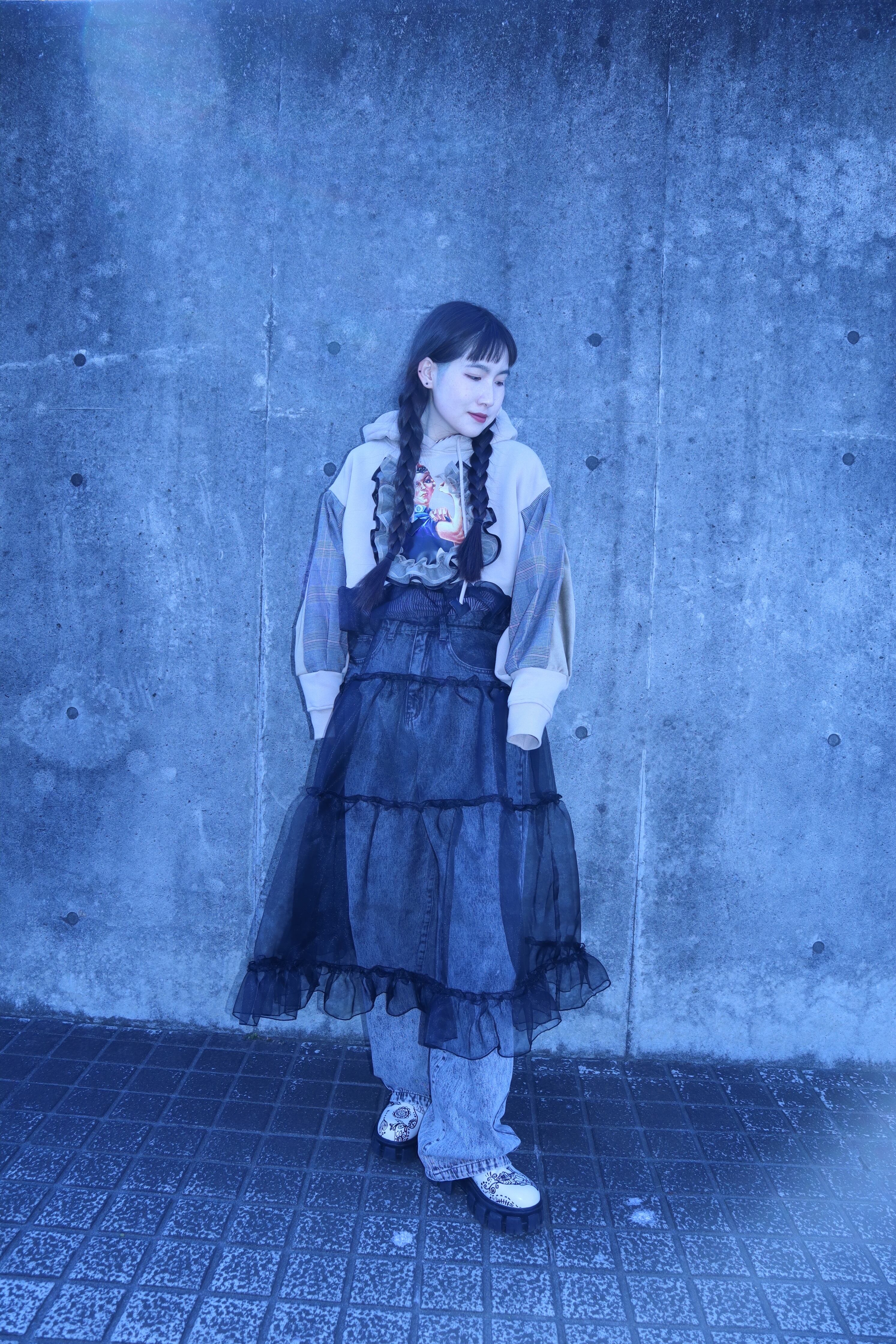 下の部分はオーガンジー素材をたっぷりと使い、ボリュームのあるデザインで、仕上げはメローを施し、他にはない可愛くカッコいいアイテムに仕上がりました。