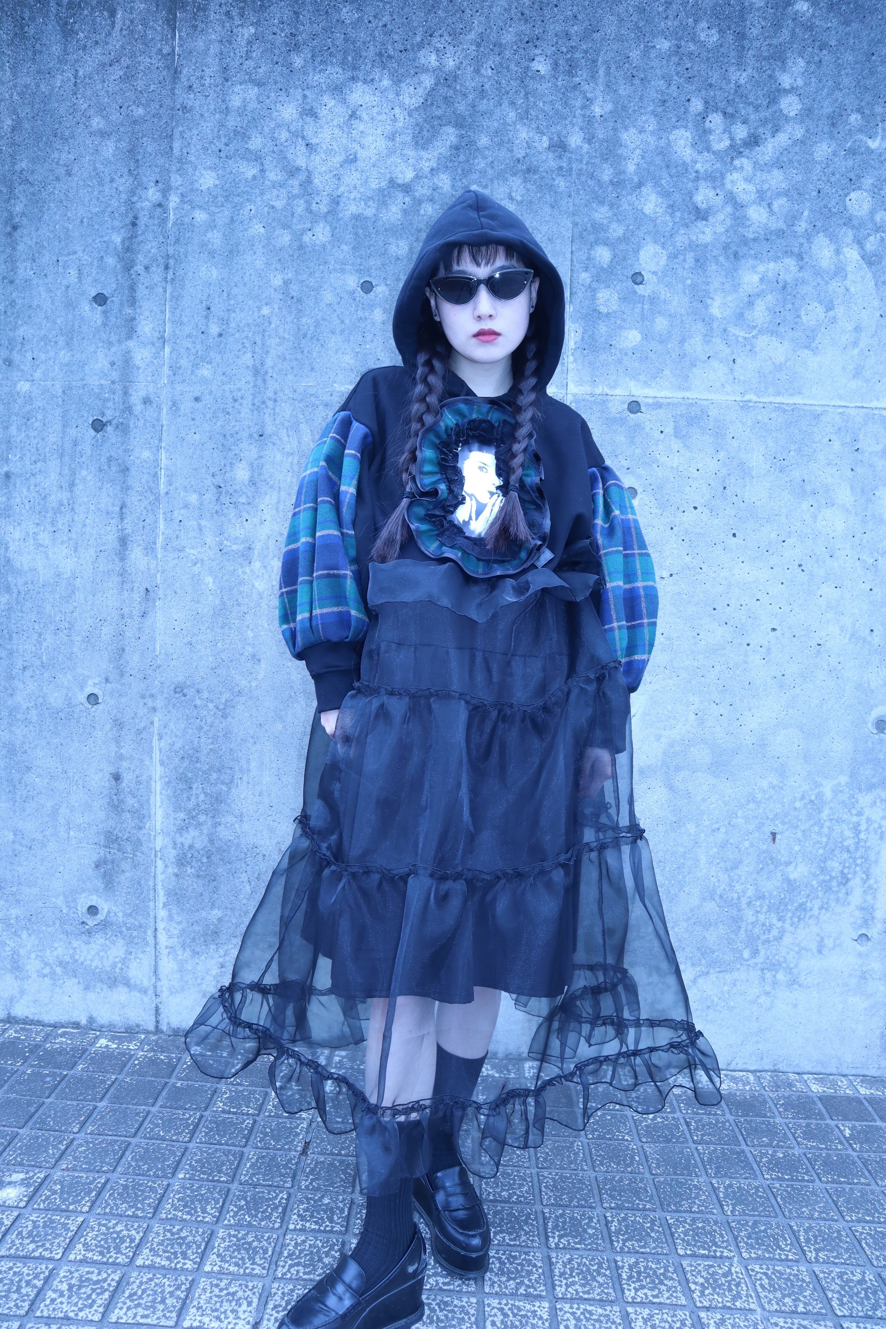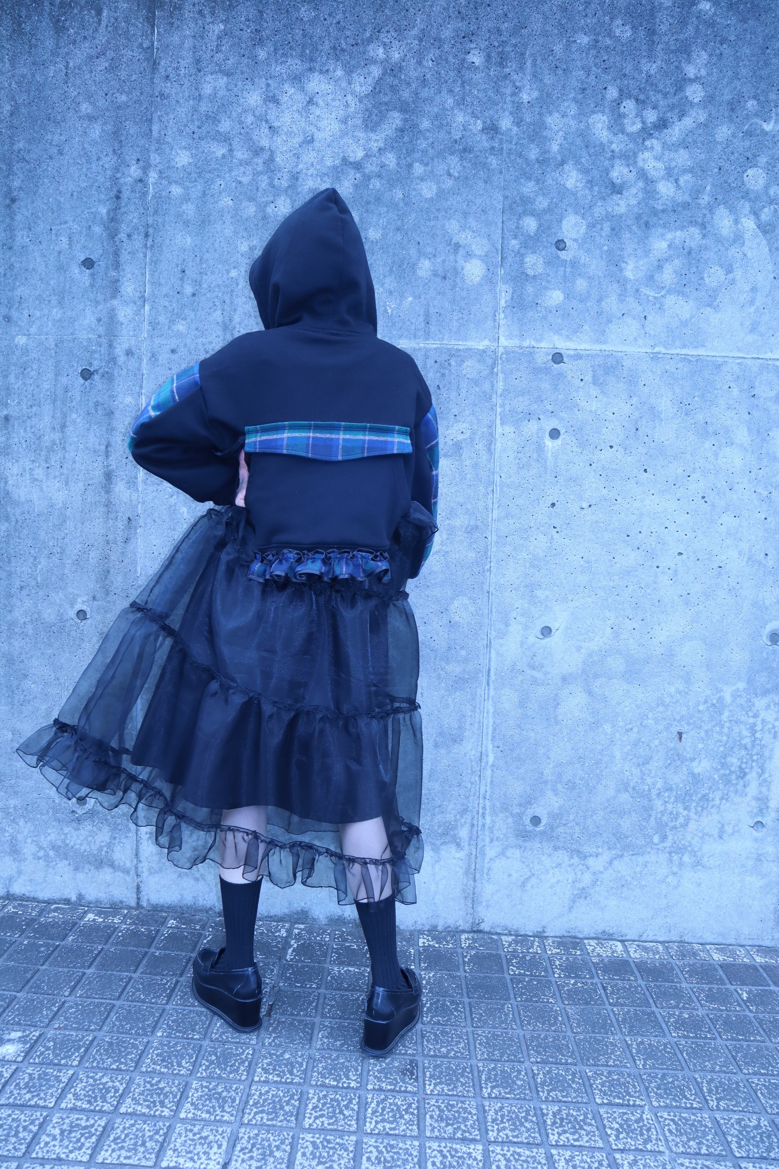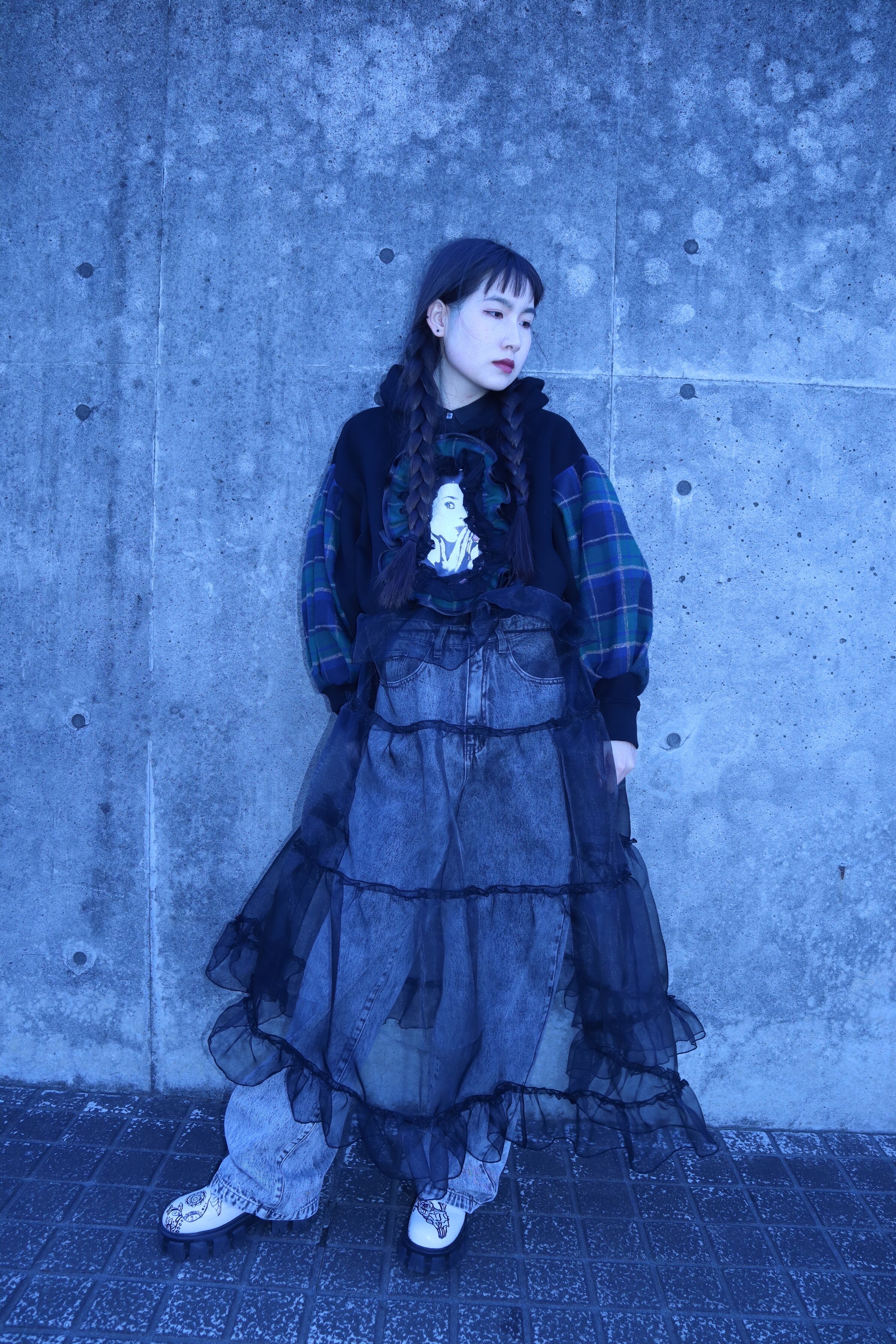 下の部分はオーガンジー素材をたっぷりと使い、ボリュームのあるデザインで、仕上げはメローを施し、他にはない可愛くカッコいいアイテムに仕上がりました。